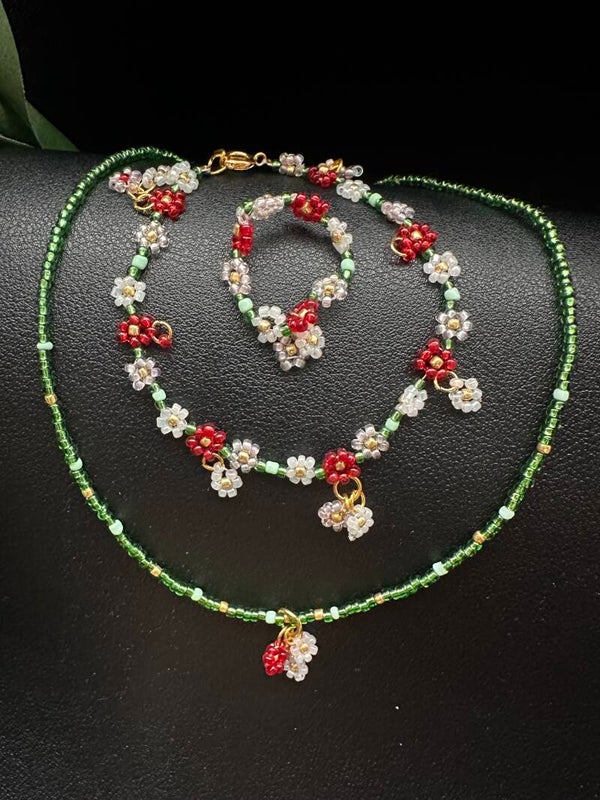 Elk stuk is met de hand geregen met hoogwaardige glaskraaltjes in zachte groentinten en gedetailleerde bloemetjes in rood, wit en transparant. De gouden accenten geven de set een luxe, warme afwerking.