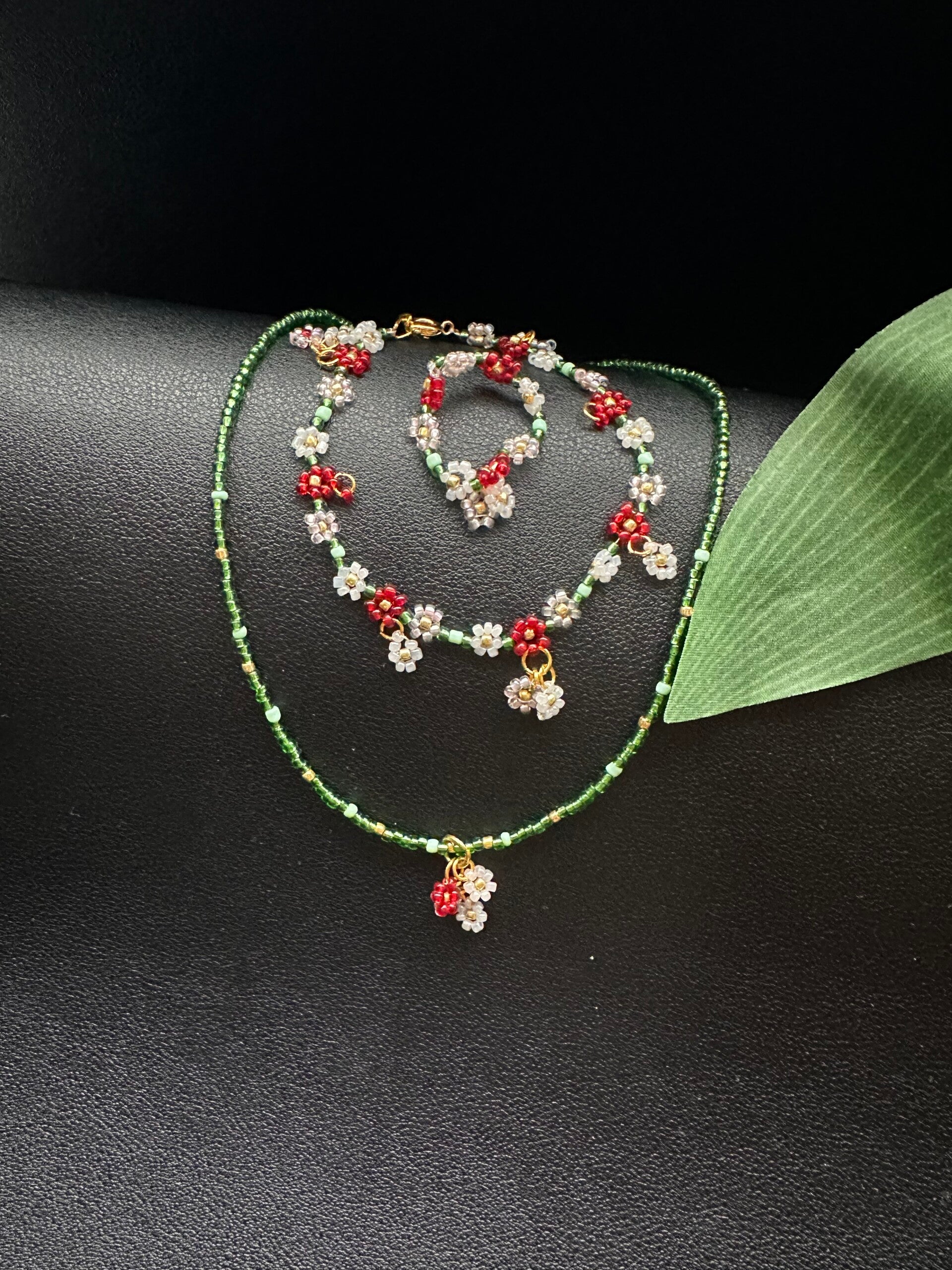 Elk stuk is met de hand geregen met hoogwaardige glaskraaltjes in zachte groentinten en gedetailleerde bloemetjes in rood, wit en transparant. De gouden accenten geven de set een luxe, warme afwerking.
