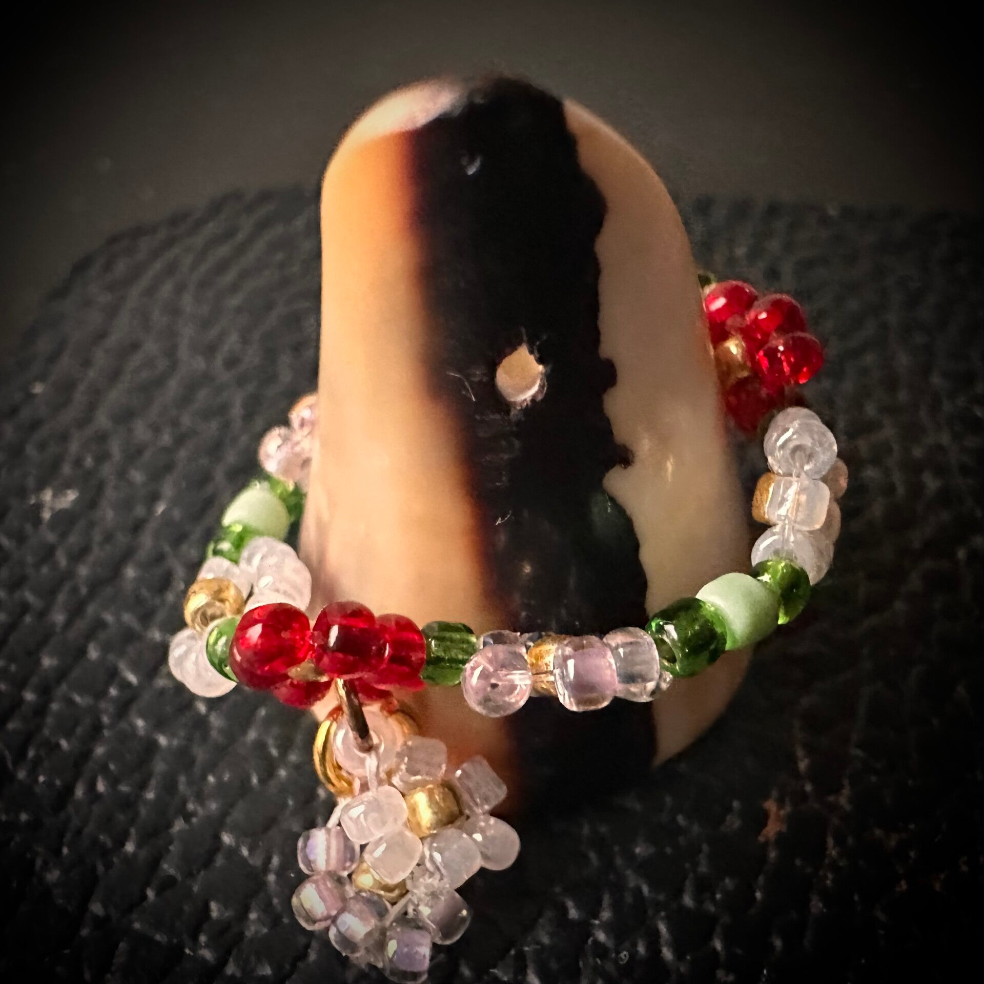 Elk stuk is met de hand geregen met hoogwaardige glaskraaltjes in zachte groentinten en gedetailleerde bloemetjes in rood, wit en transparant.