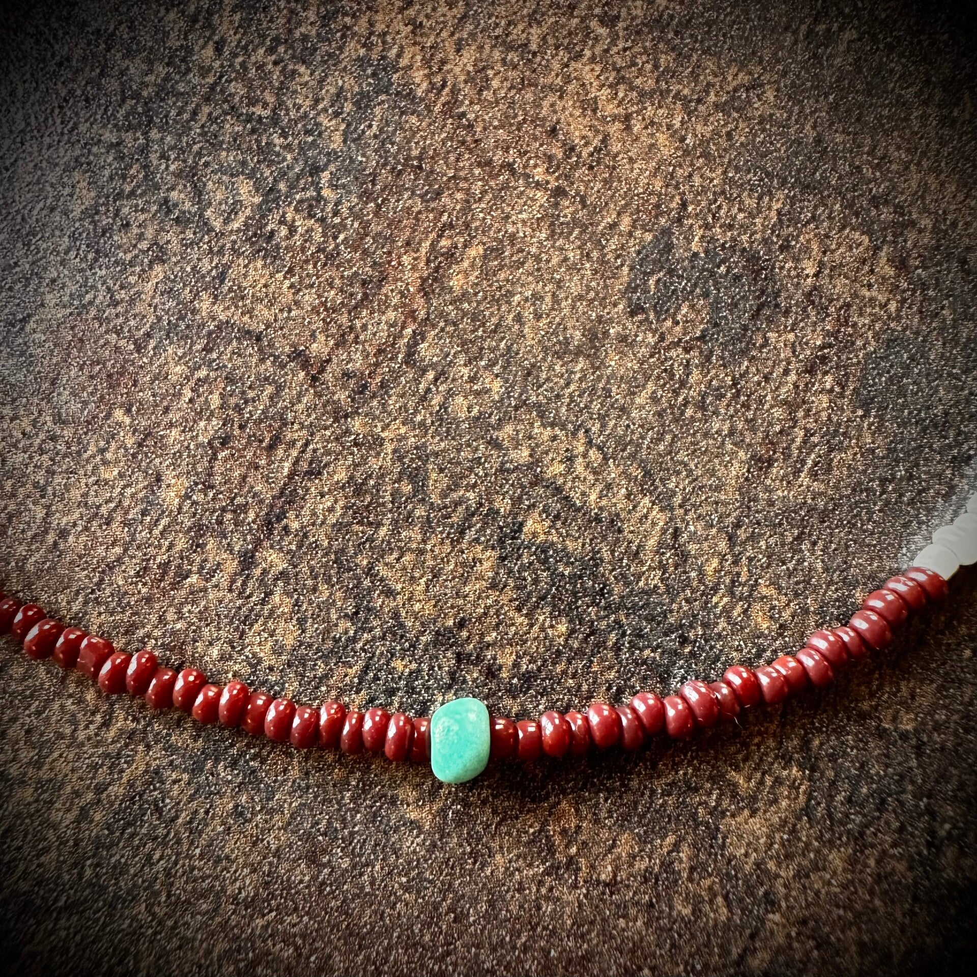 Deze unieke, handgemaakte ketting bestaat uit kleine bruine kralen met één centrale groene kraal accent