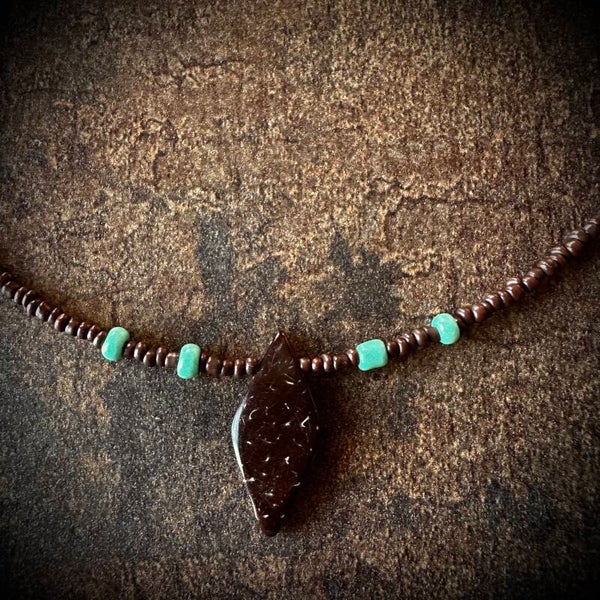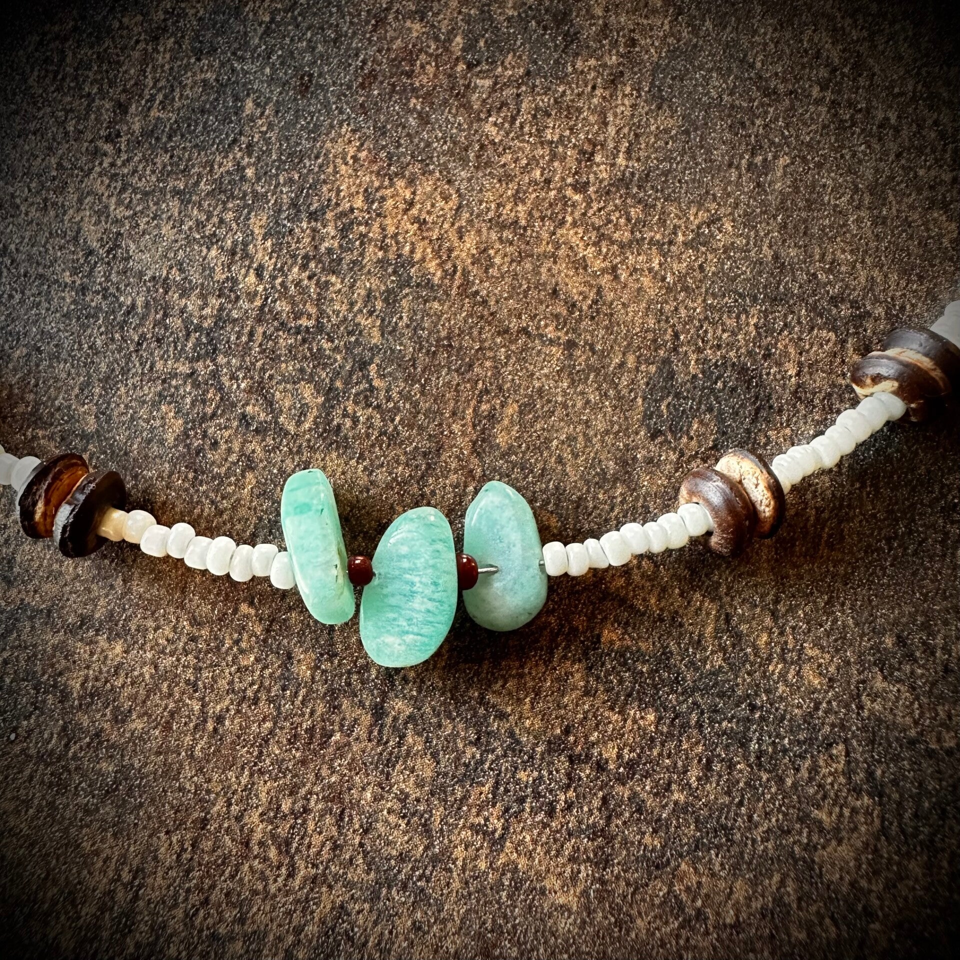 Een verfijnde handgemaakte ketting met warme bruine kralen en subtiele natuurstenen accenten. De natuurlijke kleuren geven deze ketting een rustige, aardse uitstraling. Mooi als dagelijkse favoriet of als onderdeel van een bohemian layering look.