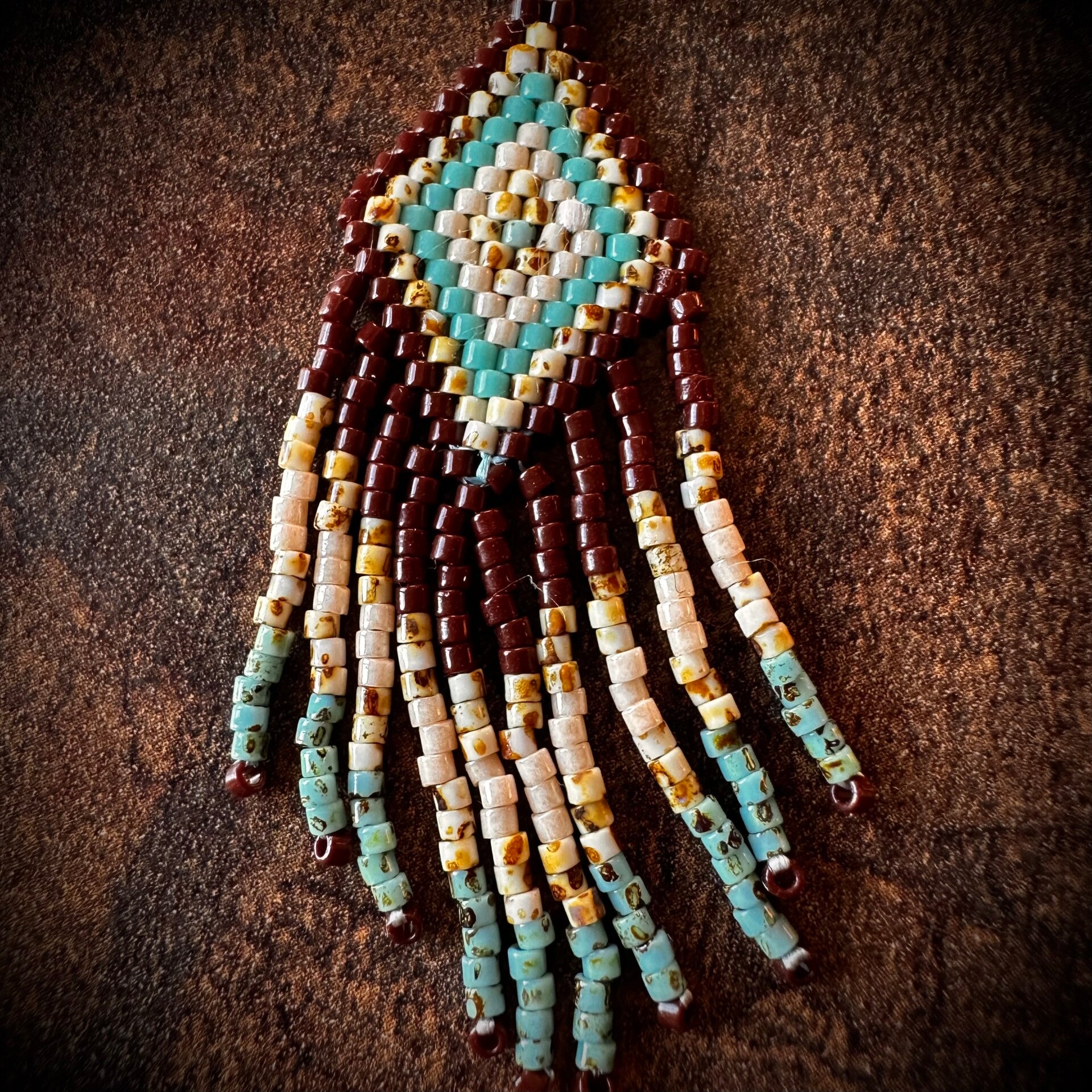 Een unieke statement ketting met een handgeweven kralenhanger en speelse franjes. Deze ketting is volledig met de hand gemaakt en geïnspireerd op natuurlijke vormen en bohemian stijlen. Elk detail is zorgvuldig geweven